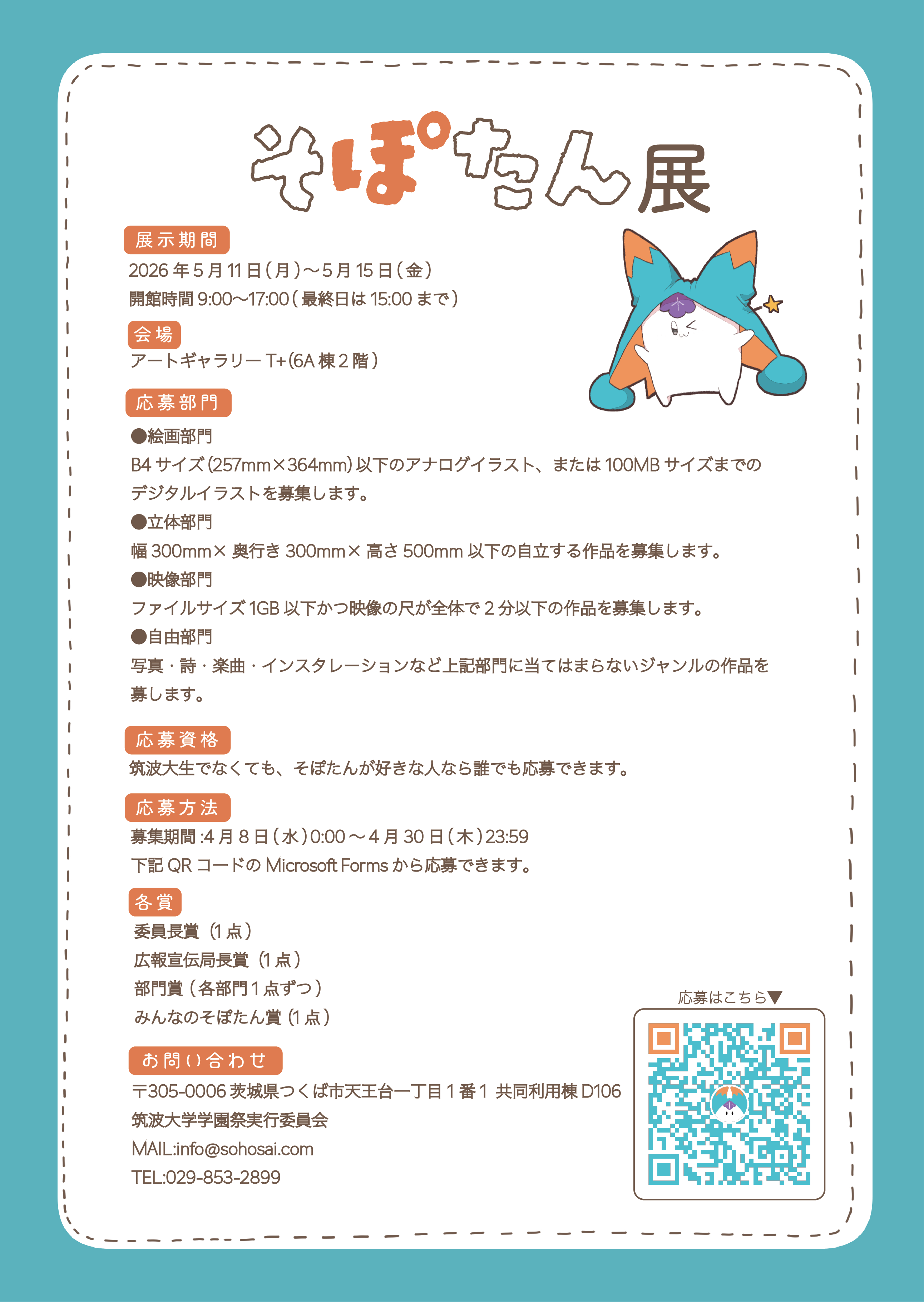 2026.04.07 そぽたん展を開催します! 今年もそぽたん展を開催します!第3回目となる今回は、絵画部門立体部門映像部門自由部門の4部門でそれぞれそぽたんにまつわる多様な作品を募集し、応募作品を5/11 (月) - 5/15 (金)に体芸エリア6A棟2階 アートギャラリーT+にて展示します。素晴らしい作品には学実委や会場投票により各賞が贈られます!レギュレーションをよく読み、応募フォームから作品をご応募ください。募集締切は4/30 (木) 23:59となります。たくさんのご応募お待ちしております!